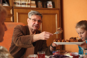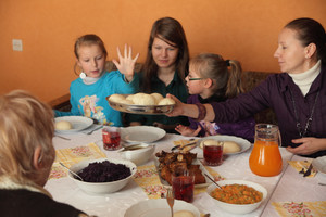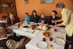Dzięki uprzejmości red. Pawła Sałackiego zostałem zaproszony do rodziny Pana Józefa Cieśli ze Śmigla na niedzielny obiad. Prosiłem mojego gospodarza w rozmowie telefonicznej, aby na okoliczność mojego przyjazdu nie przygotowywano nic szczególnego. Prosiłem, aby to był typowy obiad rodzinny. Trudno mi stwierdzić , czy na pewno w całej okazałości przygotowywane dania, ich liczna i różnorodność były typowe, ale mogę orzec, że takie wrażenie robiły. Obiad przygotowała żona Pana Józefa, Janina. Na obiad zaproszeni bili także: siostra mojego gospodarza Pani Bernadeta Maria Cieśla z Leszna, syn Jacek z żoną Katarzyną wraz z uroczymi córkami Wiktorią i Weroniką, obie są bliźniaczkami w wieku 9 lat, starszą Emilką (13) oraz najstarszym synem Kamilem (15). Po obiedzie, w trakcie „słodkiego” przyjechała z niezapowiedzianą wizytą druga siostra Pana Józefa, Wanda Strońska ze Swarzędza, wraz z mężem Jerzym. Ostatnim, ale w wcale nie najmniej ważnym, uczestnikiem tego rodzinnego spotkania był przemiły pies Gabi. Serwowano typowe polskie, wielkopolskie dania jak schabowy, zrazy zawijane oraz karkówkę pieczoną. Smakowity obiad popijano typowym domowej roboty kompotem zrobionym przez Panią domu z wiśni i czereśni. Do kawy obowiązkowym deserem był pyszny sernik. Mogłem się zapoznać z nowym zwyczajem rodziny Cieślów jakim są zjazdy rodzinne. Raz na 5 lat ze wszystkich stron w umówione miejsce zjeżdża się kilkadziesiąt osób z różnych gałęzi drzewa genealogicznego, które zawczasu jest przez przygotowywane specjalnie na to spotkanie. Wszystkie te miłe chwile są utrwalane w licznych albumach rodzinnych. Jakie to szczęście, że są jeszcze miejsca, gdzie prawdziwy album fotografii rodzinnych ma jeszcze rację bytu, a nie jest sprowadzony do folderów na twardych dyskach czy podręcznej pamięci w telefonie. Daje to nadzieję, że wnuki będą miały prawidłowy obraz modelu wielopokoloniowej rodziny i będą go powielać w przyszłości.