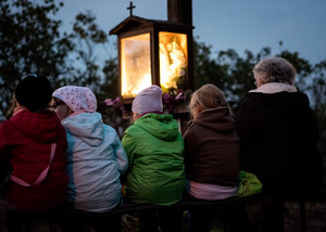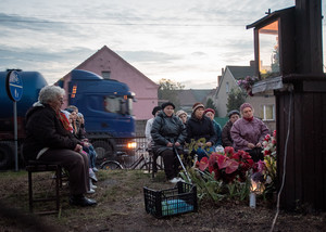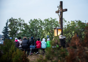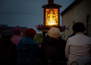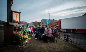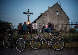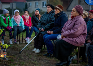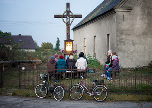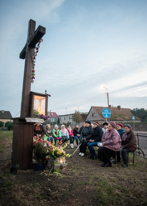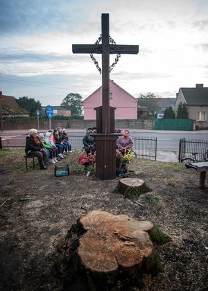 Październik – miesiąc różańca. 20.10.16 Kiełczewo. Gdy w maju odprawiano w tym miejscu nabożeństwa majowe, przy krzyżu rosły jeszcze ogromne drzewa. Musiano je wyciąć z uwagi na zagrożenie jakie stwarzały.
