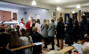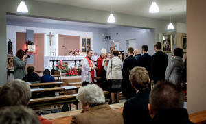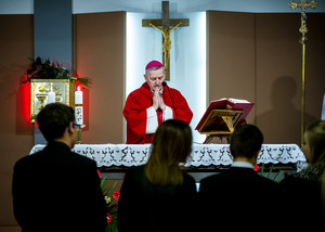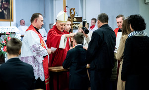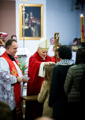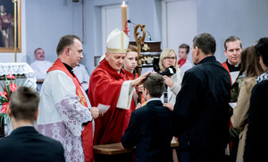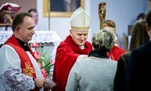 22.10.2016. Parafia p.w. św. Karola Boromeusza. Młodzież otrzymuje dary Ducha Świętego w sakramencie bierzmowania, którego udziela ks. bp Grzegorz Balcerek.